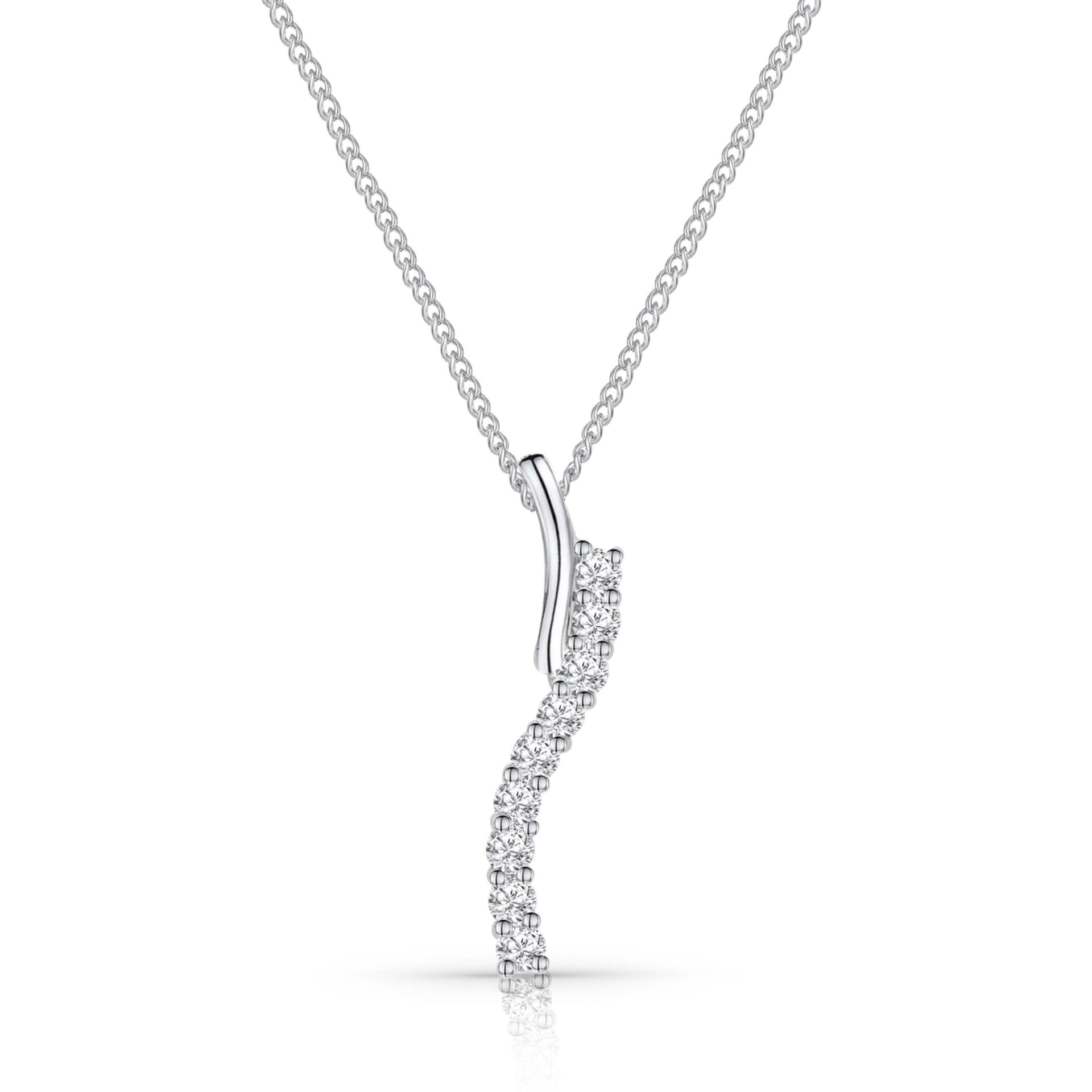 Sterling Silver Wave Pendant Set With Cubic Zirconias. 30mmx6mm Overall Diameter. 925 Sterling Silver, Rhodium Finished for Tarnish Free Wear. AAA Quality Cubic Zirconias. Supplied on a 16-18inch Adjustable Silver Chain.