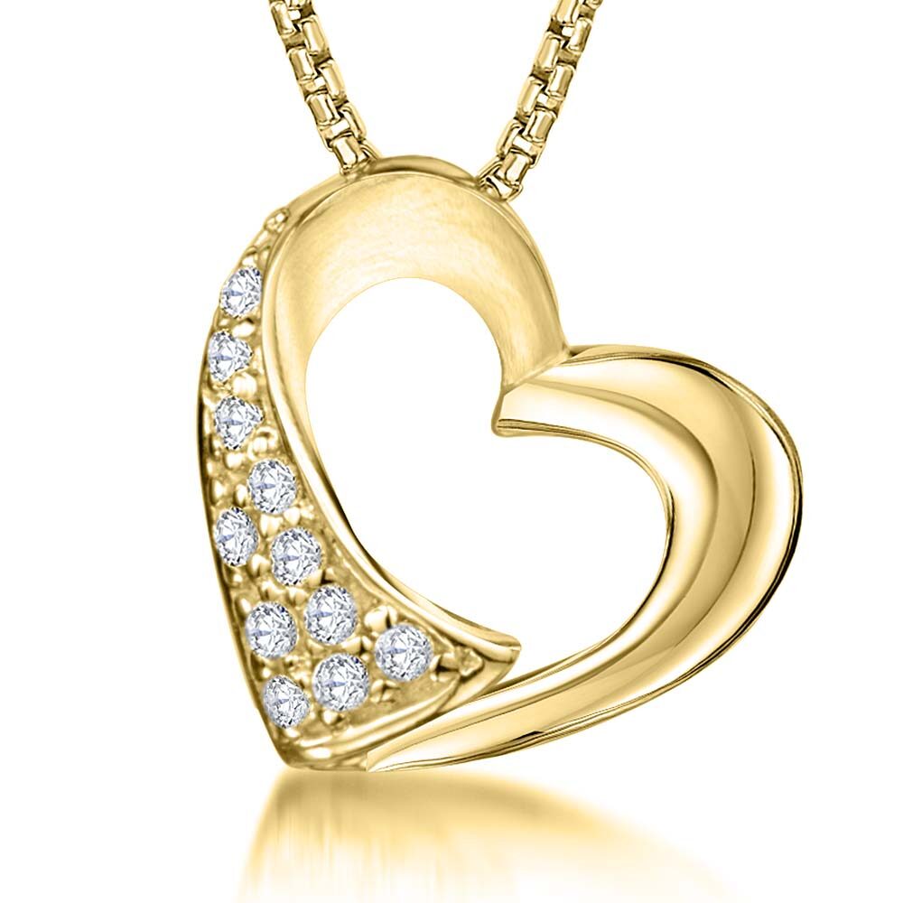 polish & satin yellow gold vermeil & 1.1, 1.2mm cz necklace, 13x13mm long offset heart