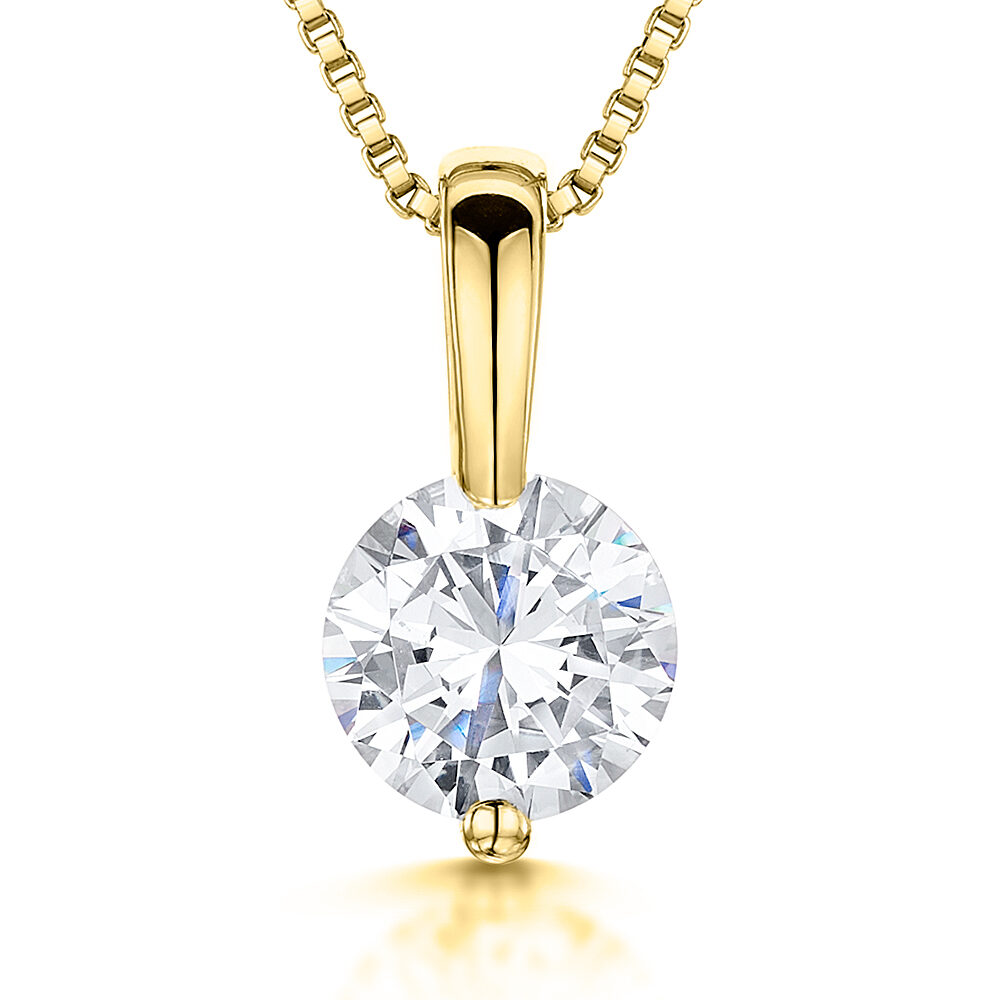 Yellow Gold Vermeil Pendant Featuring A Single 2 Carat Brilliant Cut Round CZ With A Gold Bale. 17 MM Long 8 MM 2 Carat Stone The Finest ‘AAA’ Cubic Zirconia Stones. Tarnish Free.