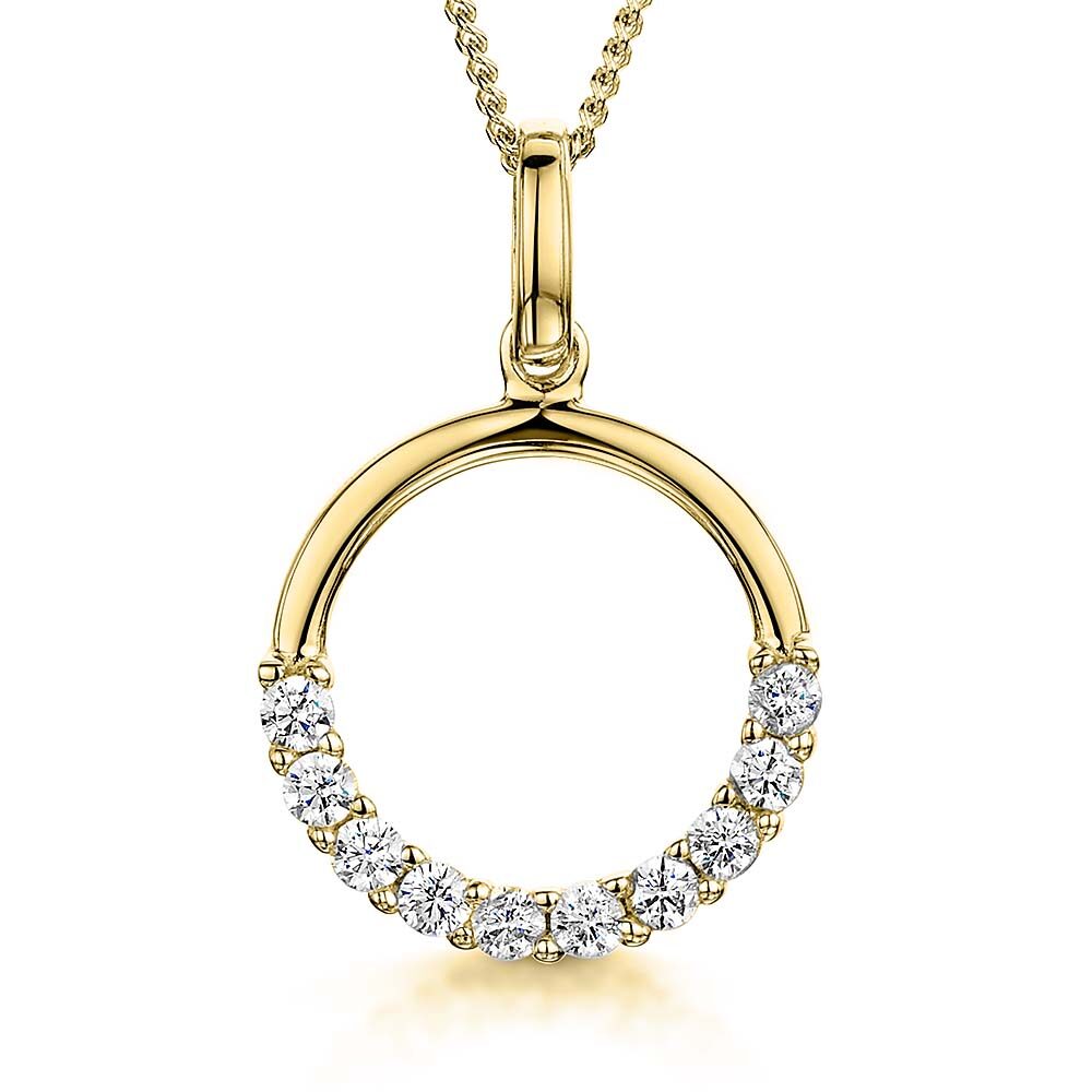 Yellow Gold Polished Circle Pendant with A Lower Section Of 2mm White Zirconia Stones Overall Diameter 15X 22mm . Tarnish Free. Finest AAA CZ Stones. Comes on A 16-18 Inch Chain.