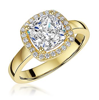 18 Carat Yellow Gold Vermeil & White Halo Cubic Zirconia 3 Carat Cushion Cut Ring With A Stone Set Surround. 3 Cushion Carat Weight with Stone Set Shoulders. The Fines AAA Cubic Zirconia Stones. Yellow Gold Plated Sterling Silver. Tarnish Free Wear